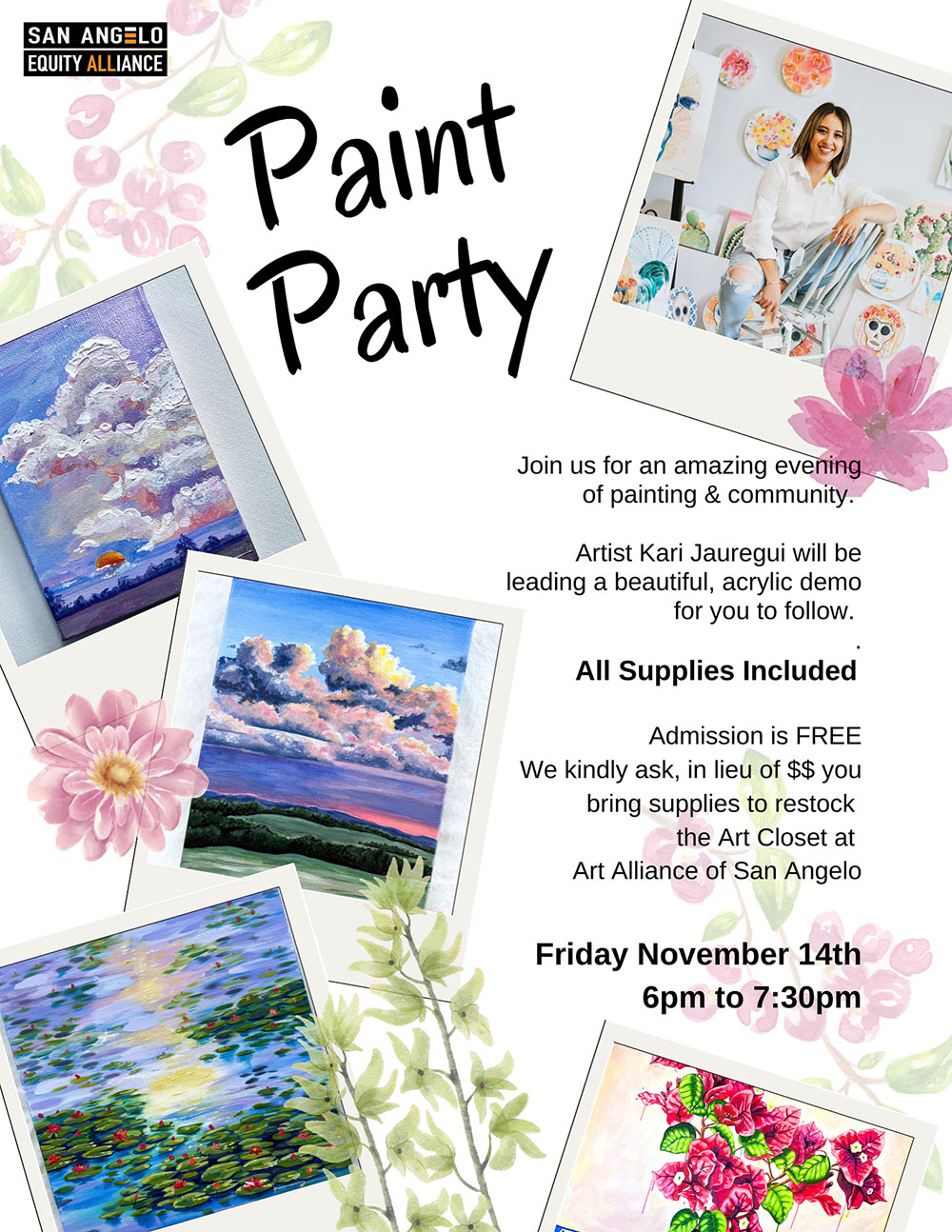 Join us for an amazing evening of painting & Community. Artist Kari Jauregui wil be leading a beautiful, acrylic demo for you to follow.